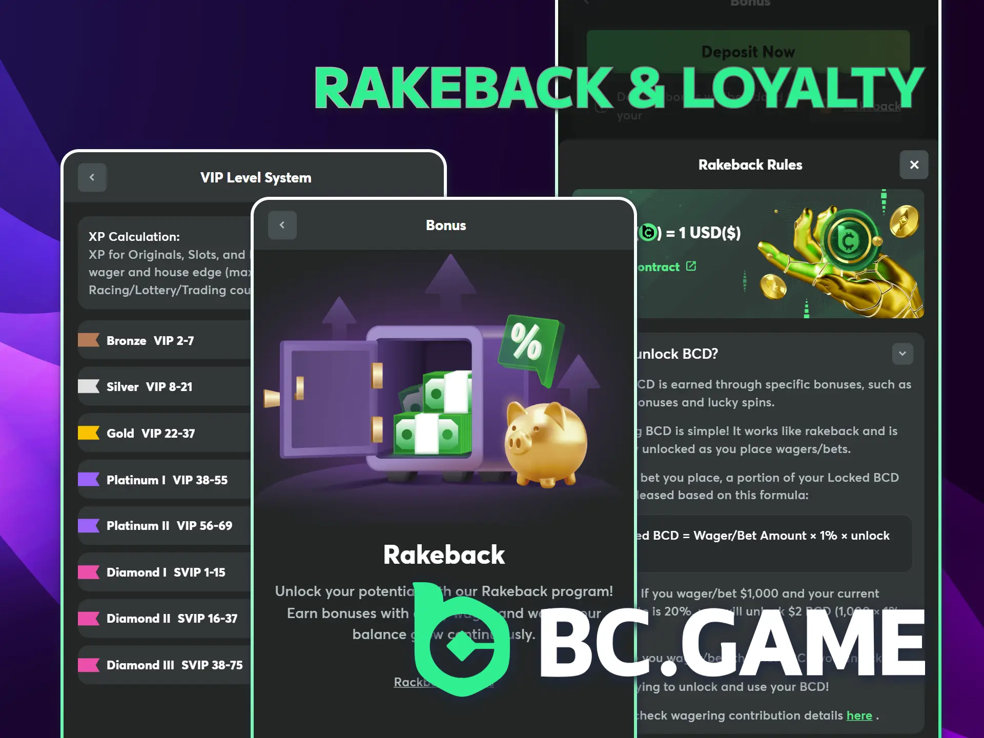 BC Game offers a built-in rakeback system using the internal BCD token. Every bet releases a portion of locked BCD based on your VIP level. A player who bets 56,000 PHP at a 20% unlock rate receives 2 BCD, which equals 112 PHP. You must claim unlocked BCD within 24 hours via the app’s bonus page.