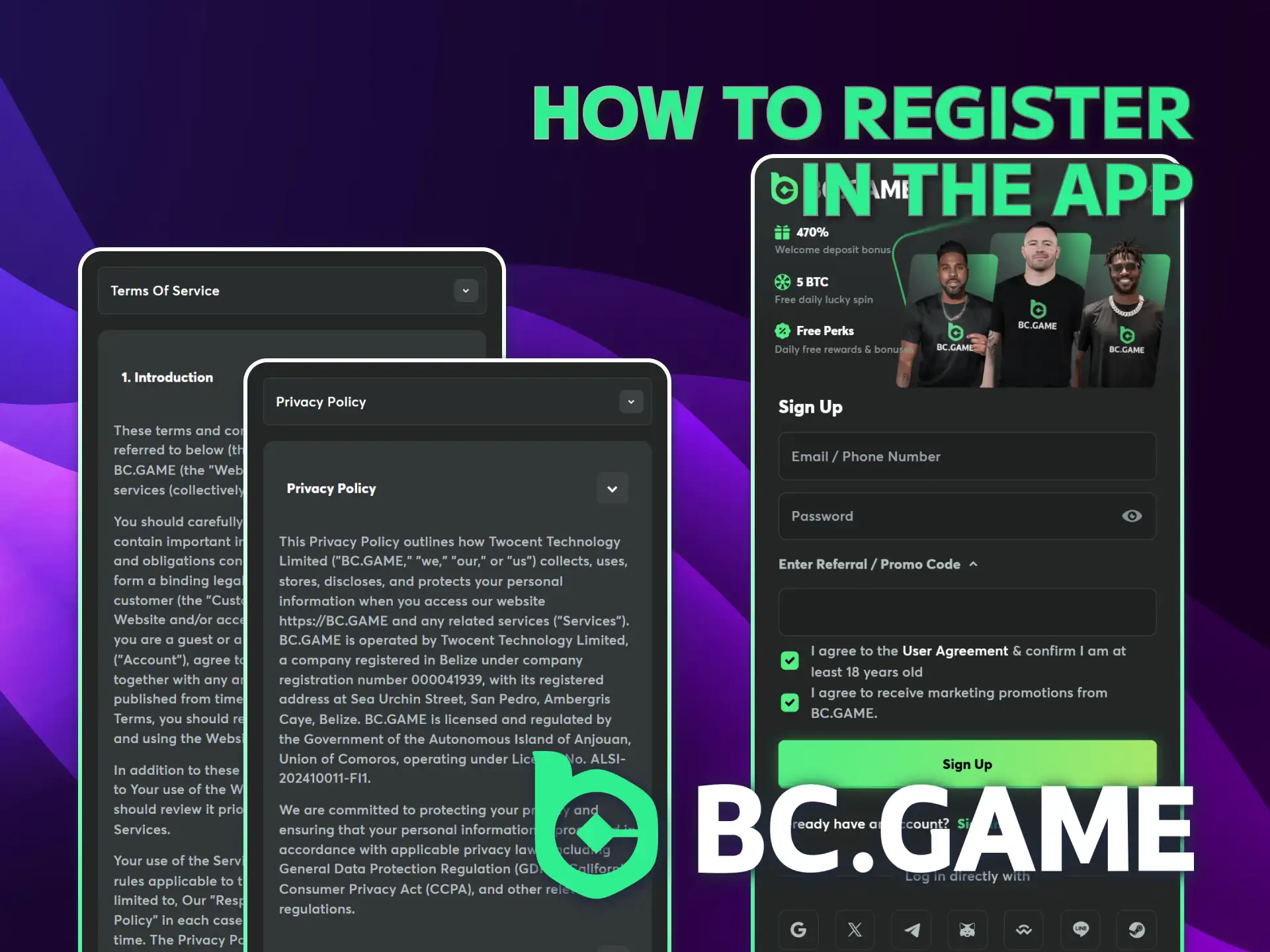 You can register a new BC Game account in the app in just a few minutes. We support registration by email, phone number, or social login through Google, Facebook, Telegram, and other options. After creating your profile, you can deposit, play, and claim bonuses right away. Registration Steps: